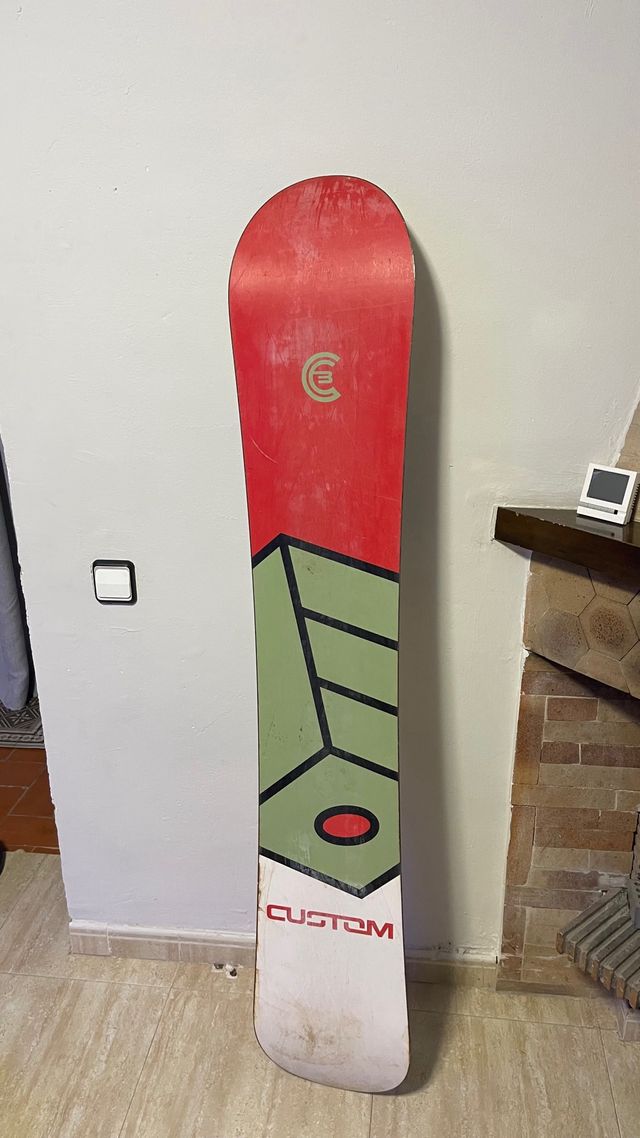 Detalles del productoTabla de snowboard Burton Custom de 161 cm. Diseño con base roja y verde con detalles en negro y un círculo rojo.