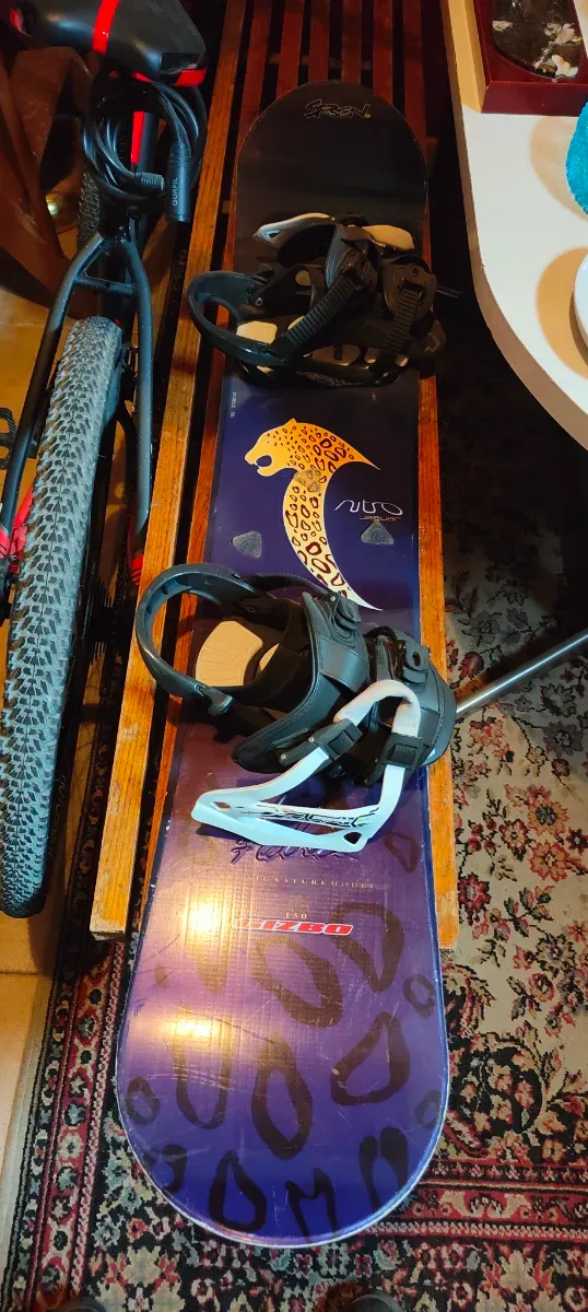 Tabla de snowboard con un diseño llamativo y fijaciones incluidas. - Diseño con estampado de leopardo y detalles en morado. - Fijaciones negras y blancas.