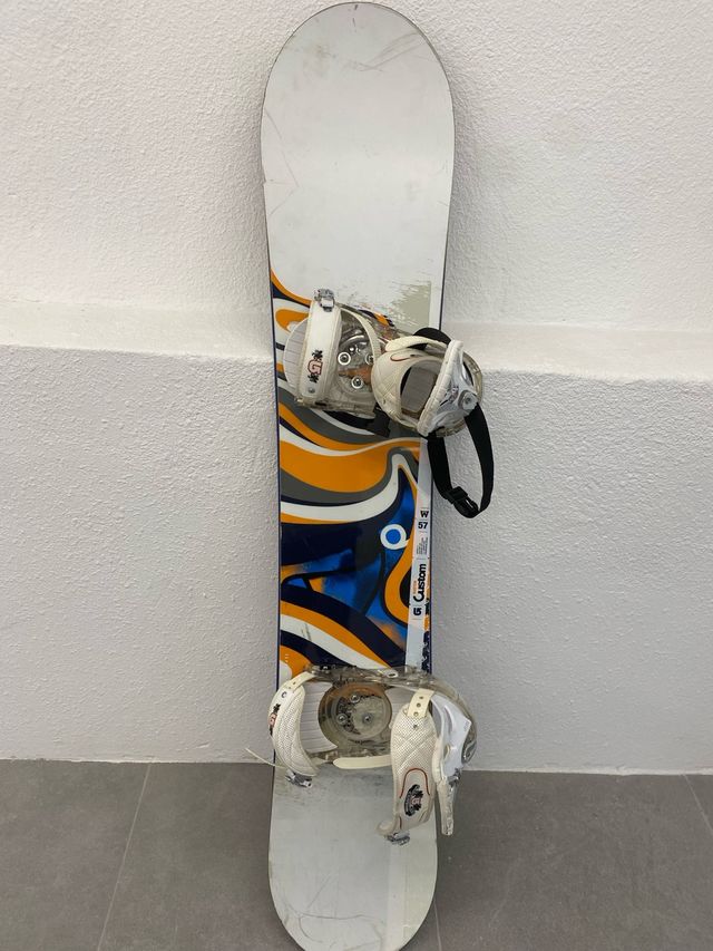 Detalles del productoTabla de snowboard con un diseño llamativo y fijaciones incluidas.