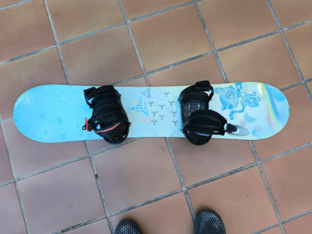 Tabla de snowboard K2 Mini Luna con un diseño divertido y colorido. - Ideal para iniciarse en el snowboard. - Fijaciones incluidas. - Gráficos de gatito y arcoíris.