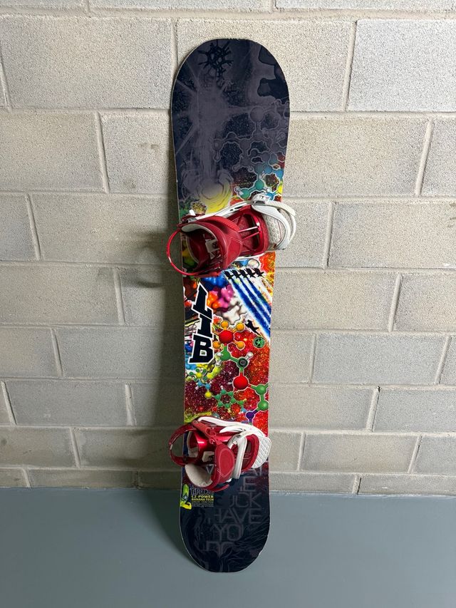 Tabla de snowboard Libtech Travis Rice - Fijaciones Unión ContacPro rojas y blancas.