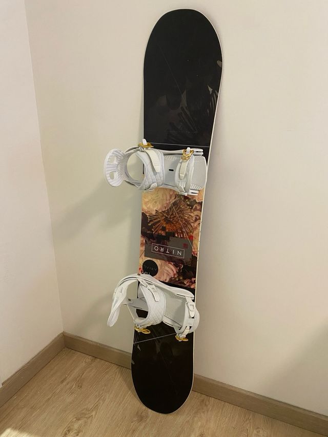 Tabla de snowboard de la marca Nitro con fijaciones incluidas. Está a estrenar, viene con una funda Burton.