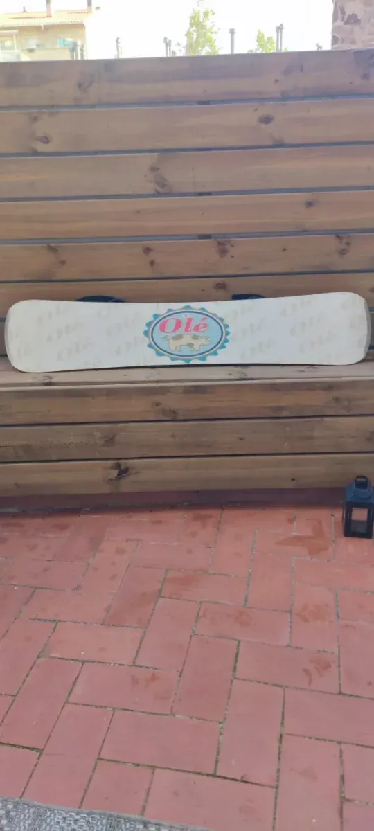 Tabla de snowboard con un diseño retro y divertido. - Gráfico Olé con un cerdo. - Base blanca con detalles gráficos.