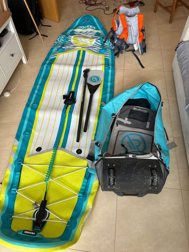 Detalles del productoTabla de Stand Up Paddle (SUP) inflable de la marca Rocker. Incluye accesorios para su uso y transporte.