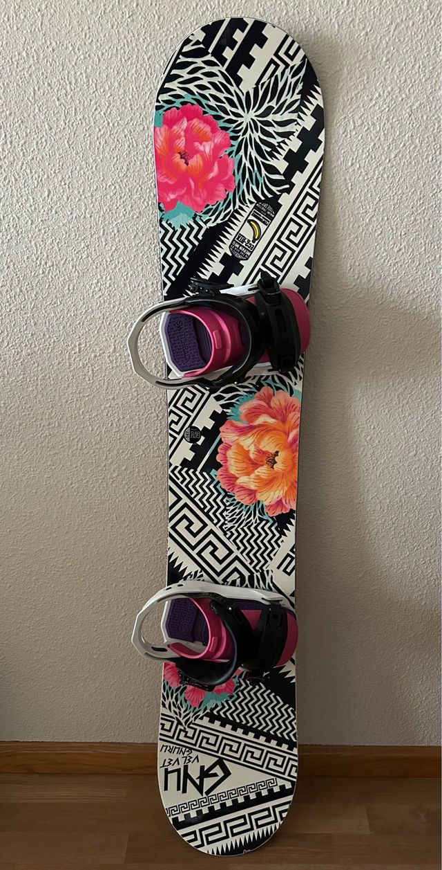 Detalles del producto-Tabla de snowboard GNU con un diseño floral y geométrico en blanco y negro.