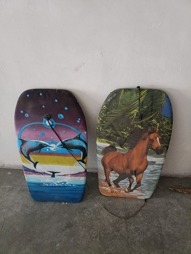 Dos tablas de natación con diseños llamativos para disfrutar en el agua. - Tabla con diseño de delfines y estrellas. - Tabla con diseño de caballo y palmeras.