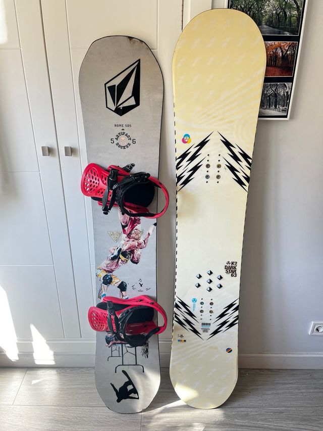 Detalles del productoSe venden dos tablas de snowboard: una Rome Artifact de 156 cm y una K2 Dark Star de 163 cm. Ambas tablas están listas para la montaña. Fijaciones Flux incluidas