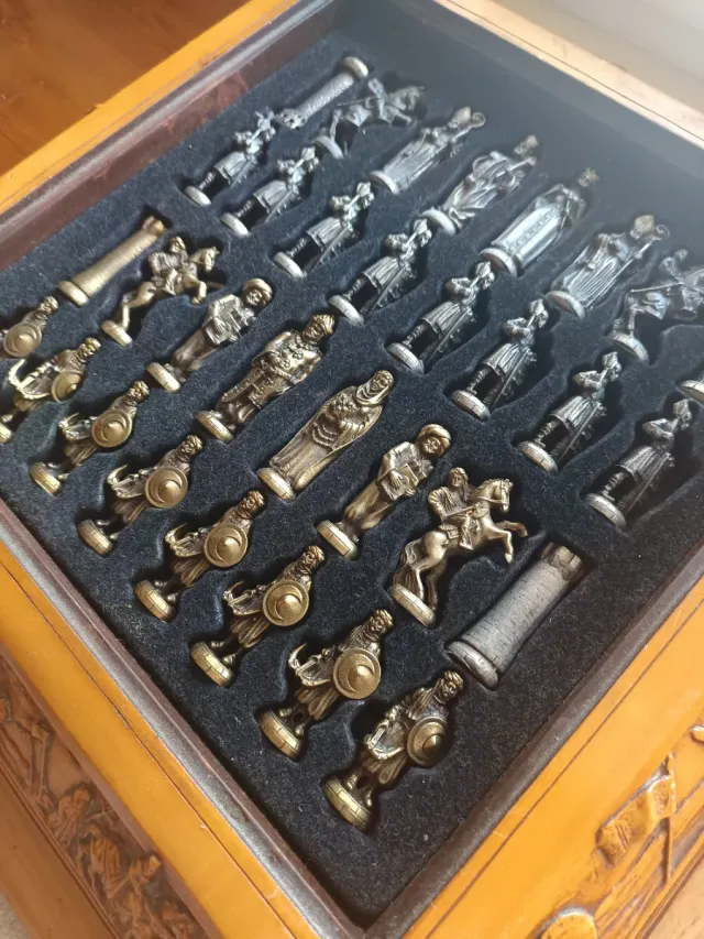- Piezas de ajedrez de metal con acabado envejecido.
