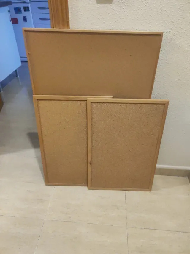 Detalles del productoConjunto de tres tableros de corcho con marcos de madera.