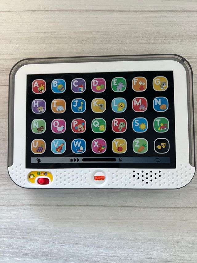 Tableta interactiva de Fisher Price con letras y números. - Diseño colorido con imágenes de animales. - Botones para aprender el abecedario y los números.