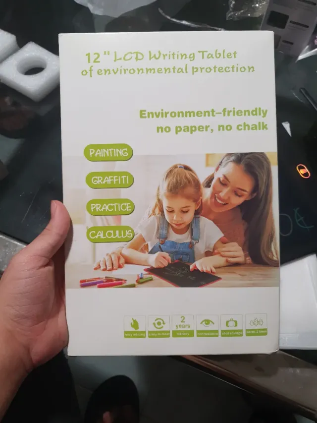 Detalles del productoTableta de escritura LCD de 12 pulgadas, ideal para dibujar y tomar notas de forma ecológica.