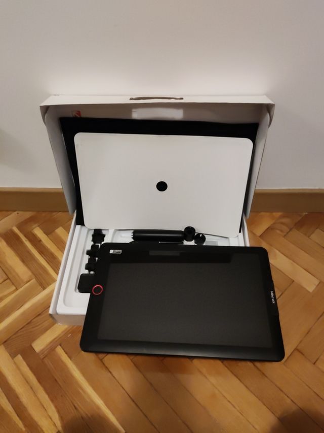 Tableta gráfica con cables HDMI, cables de carga y lápiz digital (nuevo) con las 9 puntas de recambio, en práctico maletín para transportar.