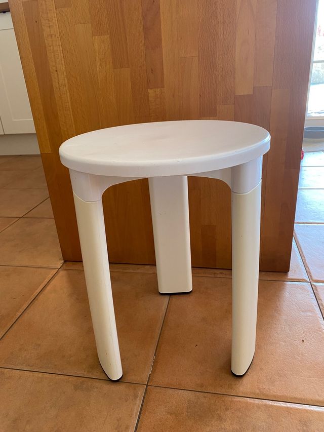 Taburete de marca Tatay, resistente, blanco y se le pueden quitar las patas. Tengo dos taburetes. haria precio por los dos