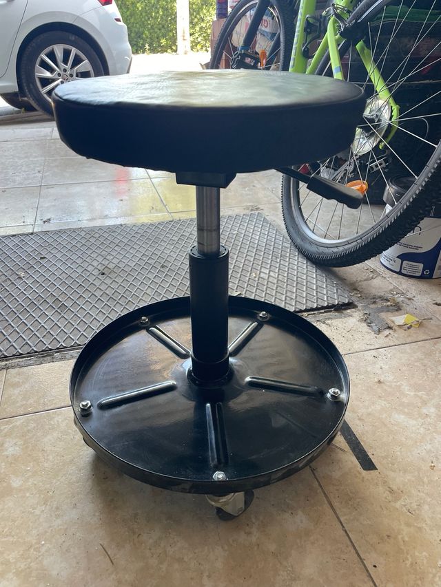 Detalles del productoTaburete de taller JBM con ruedas, regulable en altura y asiento acolchado.