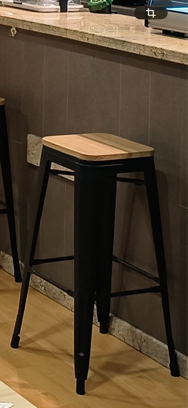 Conjunto de 6 taburetes de barra con un diseño industrial. - Asiento de madera. - Estructura metálica negra.