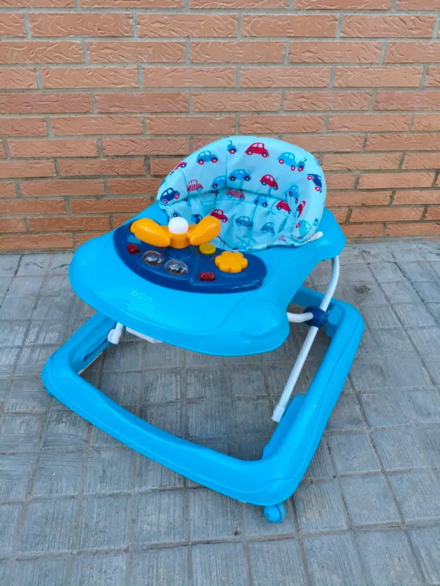 Detalles del productoTacatá de bebé en color azul, con asiento acolchado y estampado de coches.