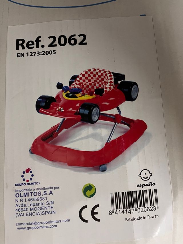 Tacatá para bebé con diseño inspirado en un coche de carreras. - Estructura de color rojo. - Asiento acolchado con estampado de cuadros. -Usado pero guardado bien
