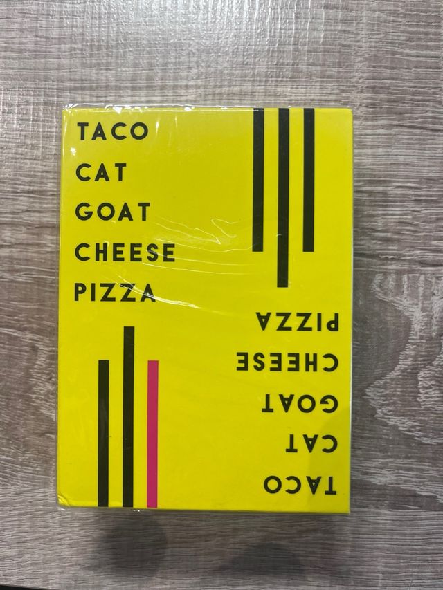 Taco Gato Cabra Queso Pizza es un juego de cartas frenético en el que los jugadores toman turnos diciendo “taco, gato, cabra, queso, pizza” mientras van colocando cartas en una pila central.
