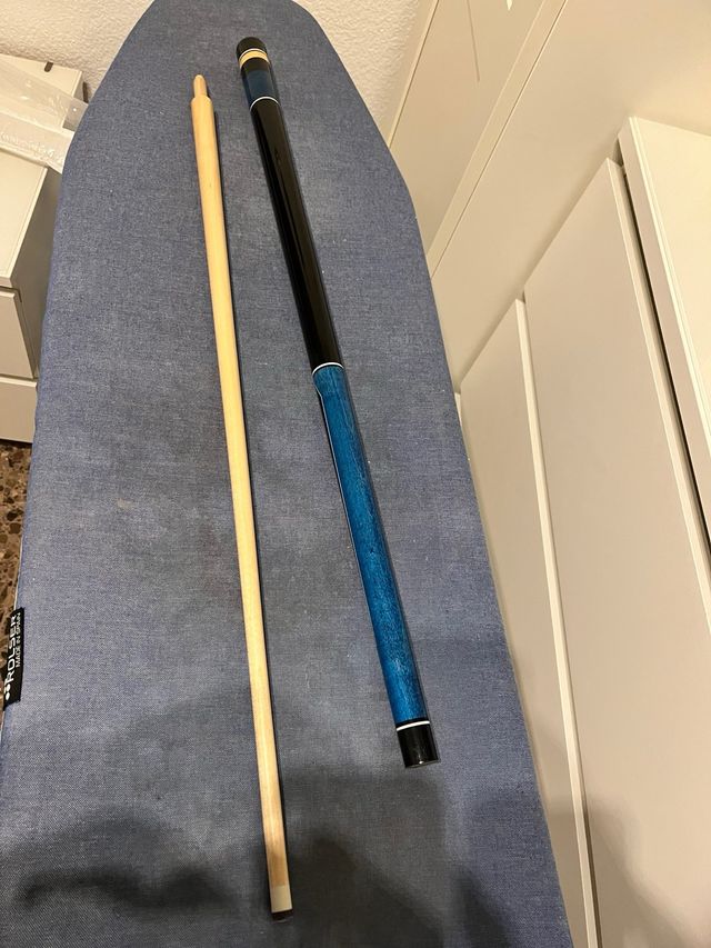 Detalles del productoTaco de billar de dos piezas, ideal para 3 bandas. Presenta un diseño elegante con detalles en azul y negro.