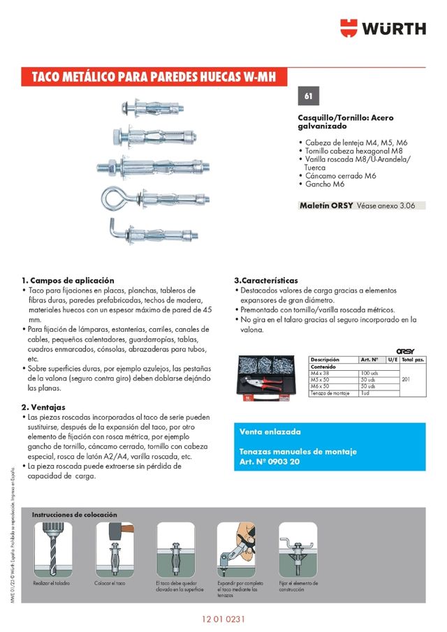Detalles del productoTaco metálico WURTH W-MH4; para fijaciones de placas, planchas, tableros de fibras duras, paredes prefabricadas, techos de madera, materiales huecos con un expedir máximo de pared de 45 mm. Todo ello en maletin ORSY de WURTH. Incluye tenaza manual de montage y maleta ORSY 100 de 33x24x6