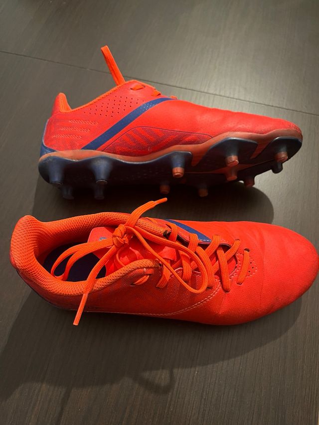 Tacos deportivos de color naranja con detalles en azul, diseñados para fútbol o rugby. Talla 36 Marca kiptsa