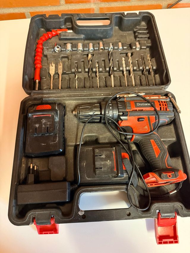 Detalles del productoTaladro a batería en su maletín de transporte, listo para tus proyectos.