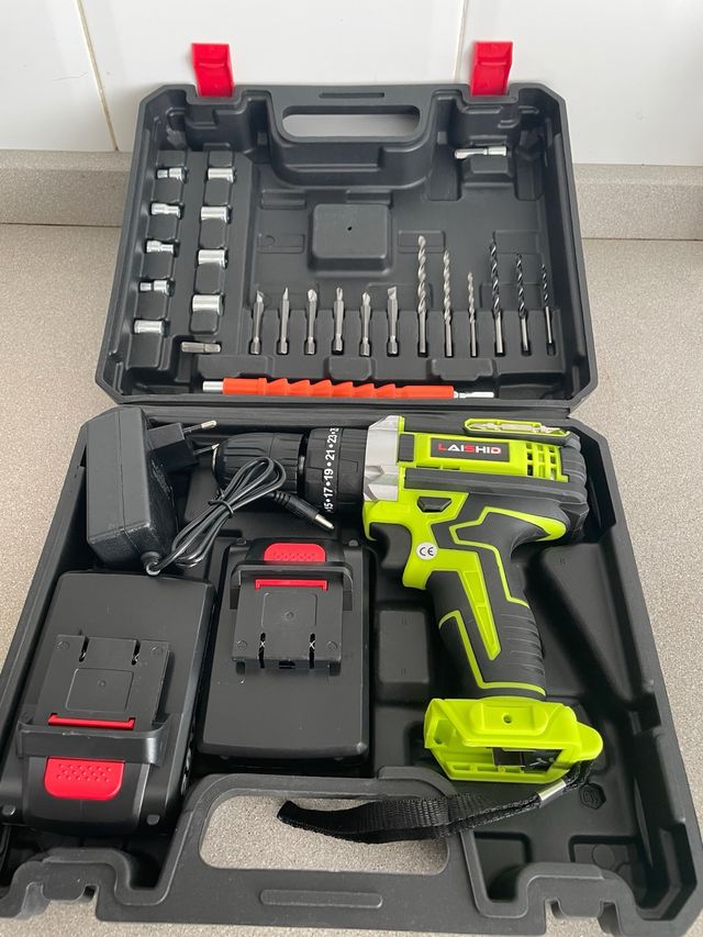 Detalles del productoTaladro inalámbrico de color verde y negro, ideal para trabajos en casa o profesionales. Incluye su maletín para guardarlo y transportarlo fácilmente.