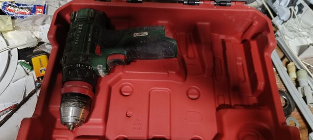 Taladro atornillador compacto de la marca Parkside. - Color verde y negro. - Incluye maletín rojo.