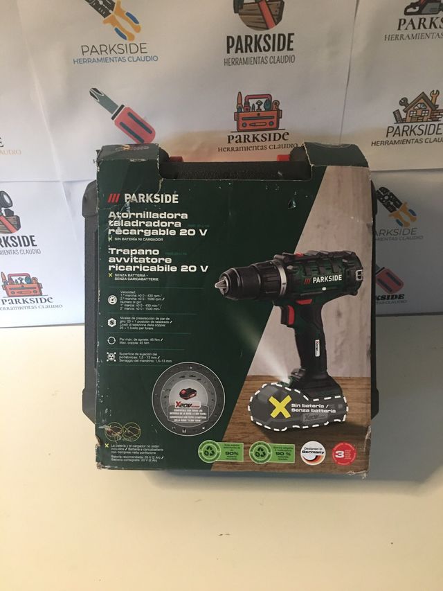 Detalles del productoTaladro atornillador recargable Parkside de 20V.