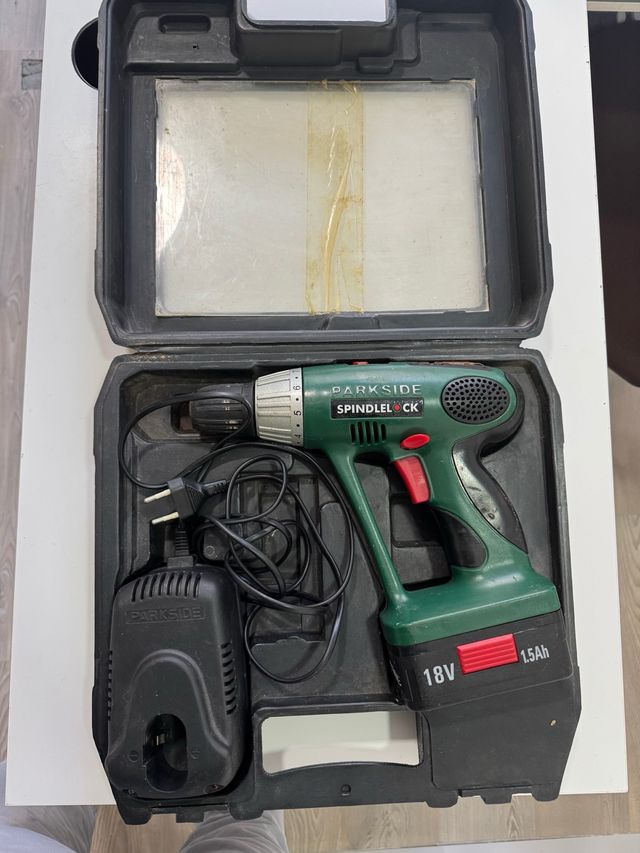 Detalles del productoTaladro atornillador Parkside Spindlelock con batería de 18V.