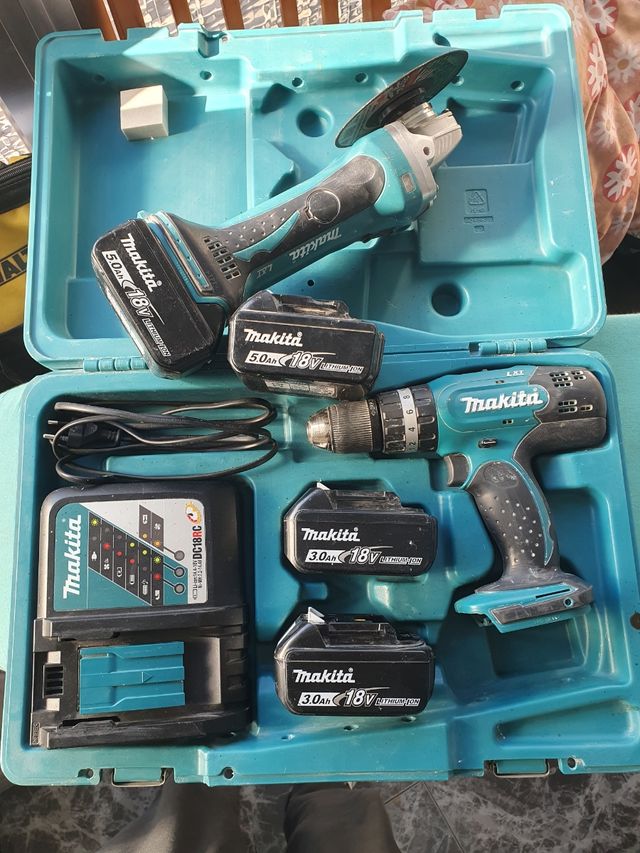 Detalles del productoSet de herramientas eléctricas Makita que incluye taladro, atornillador y amoladora.