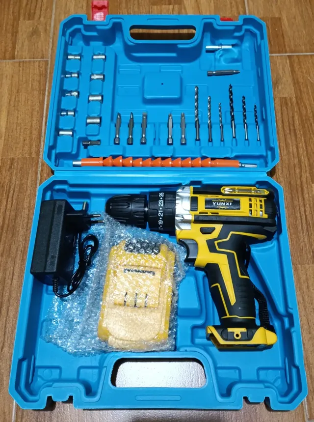 Detalles del productoTaladro atornillador inalámbrico de la marca YUNXI, ideal para trabajos en el hogar o profesionales. Incluye su maletín y accesorios.