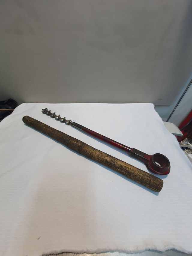 Herramienta de taladro de barrena antigua. - Diámetro de 20 mm. - Mango de madera.
