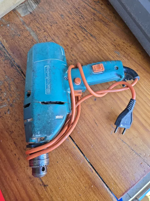 Taladro eléctrico de la marca Black & Decker. - Color azul. - Cable de alimentación naranja.