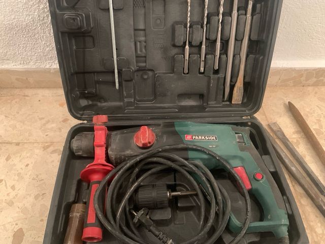 Taladro cincelador Parkside en su maletín. - Incluye brocas y cinceles. - Maletín de transporte.