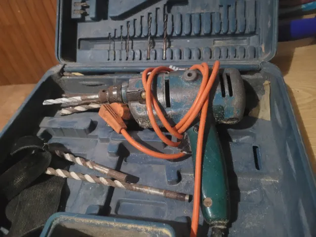 Taladro eléctrico con su maletín de transporte y varias brocas. - Maletín azul. - Cable de alimentación naranja. - Incluye brocas de diferentes tamaños.