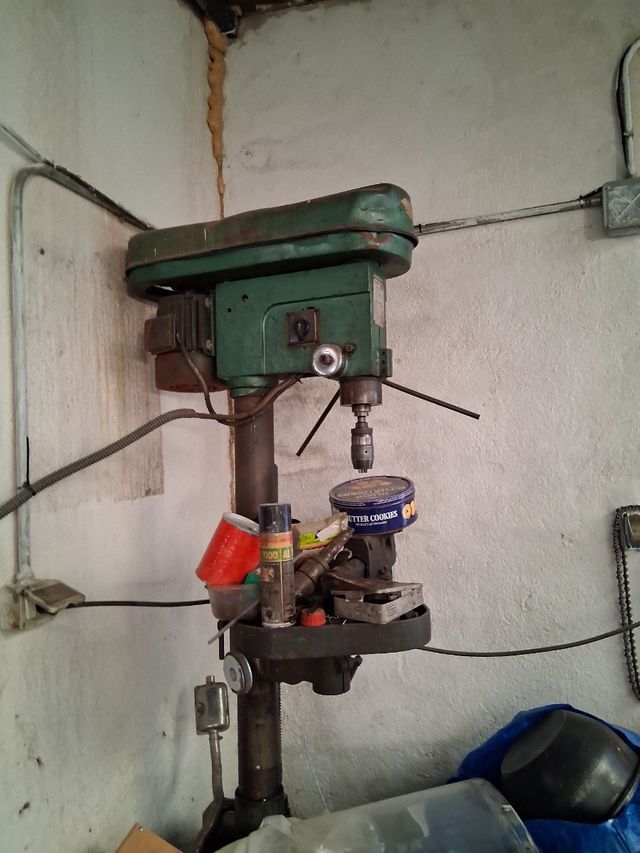 Taladro de columna en color verde, ideal para trabajos en taller. - Estructura robusta. - Interruptor de encendido/apagado. - Plato de trabajo ajustable.
