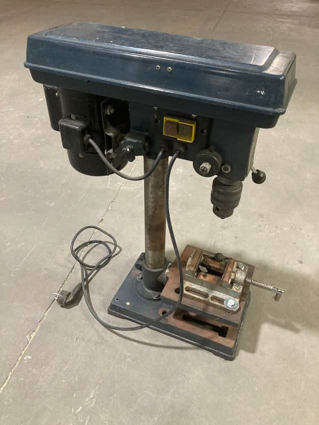 Detalles del productoTaladro de banco en color azul oscuro, ideal para trabajos de precisión. Diámetro maximo 16 mm, 500 w, con doble correa para regular la velocidad.