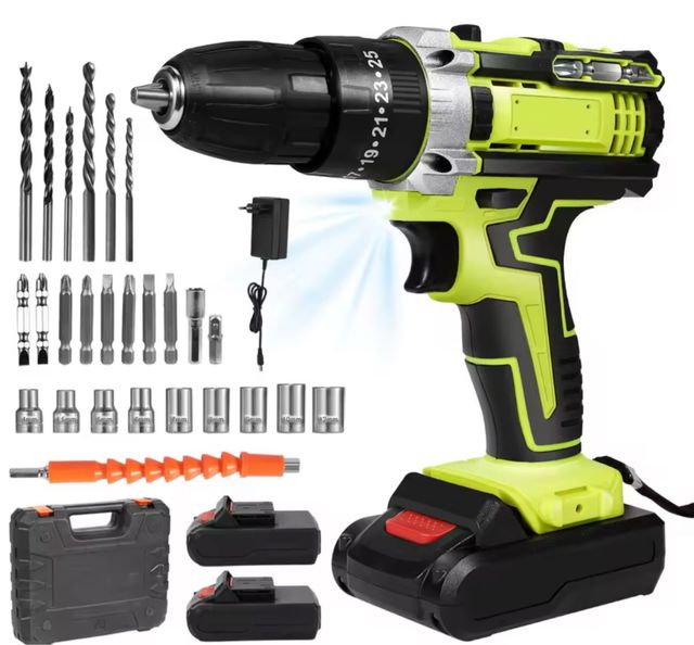 Detalles del productoSet completo de taladro inalámbrico con múltiples accesorios para diversas tareas.