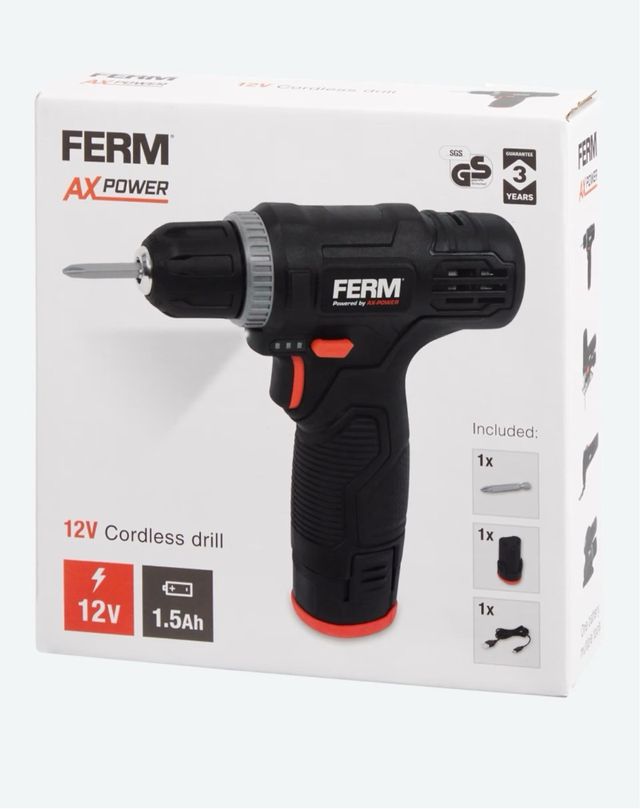 Taladro inalámbrico FERM AX POWER de 12V. - Incluye broca. - Batería de 1.5Ah. - Cargador incluido.