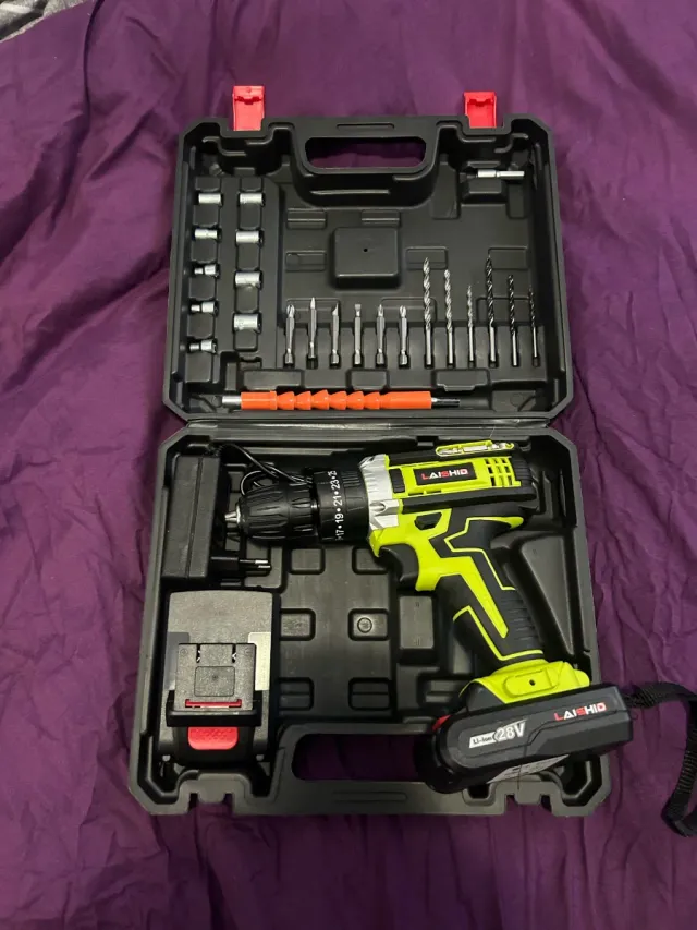 Detalles del productoTaladro eléctrico inalámbrico de impacto LAISHID, ideal para trabajos en casa o profesionales. Incluye baterías y accesorios.