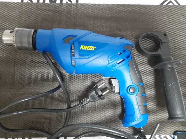 Detalles del productoTaladro eléctrico de la marca Kinzo en color azul. Incluye mango auxiliar para mayor control.