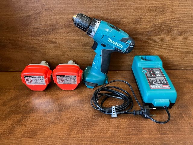 Taladro atornillador Makita, en buen estado y funcionando correctamente. Tiene dos velocidades y regulador de par. Con dos baterías y el cargador.