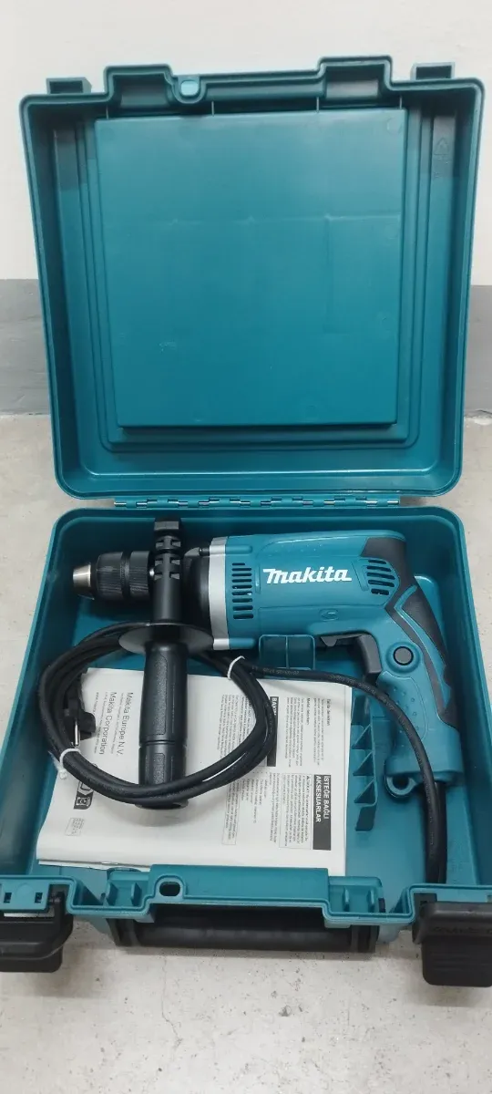 Taladro percutor Makita HP1631K en su maletín original. - Incluye taladro, empuñadura auxiliar y maletín. - Manual de instrucciones.