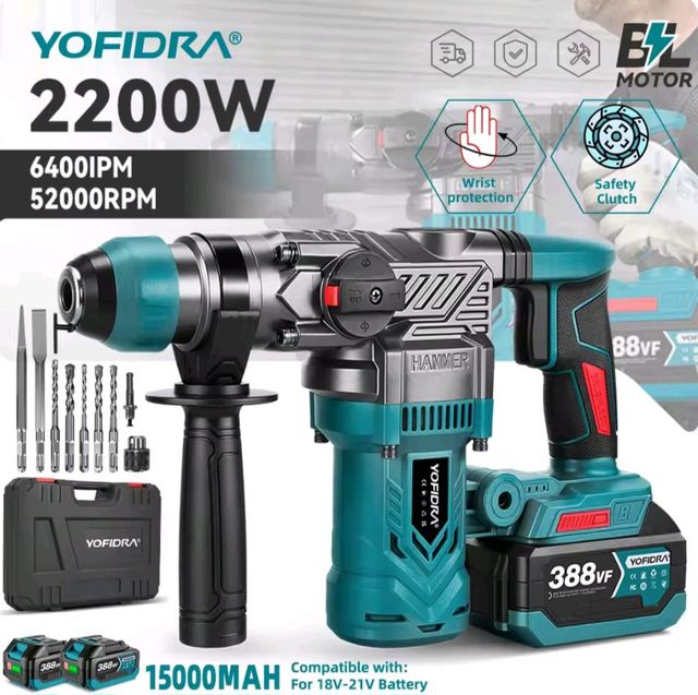 Martillo 2200w perforador y cincelador de demolición a baterías. Potente y versátil, ideal para perforar hormigón, ladrillo y mampostería.