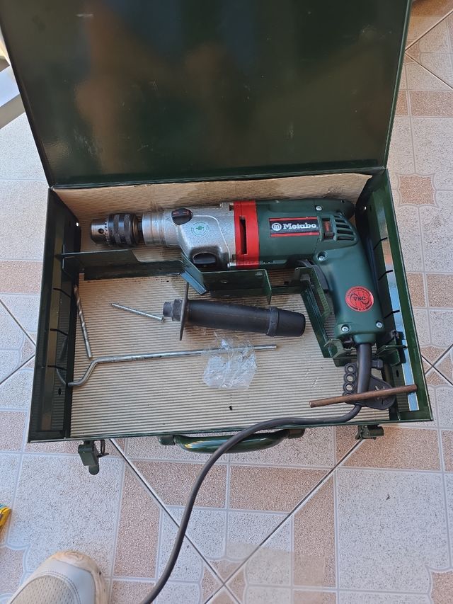 Taladro Metabo en su maletín. - Incluye taladro, empuñadura auxiliar y llave. - Maletín de transporte verde.