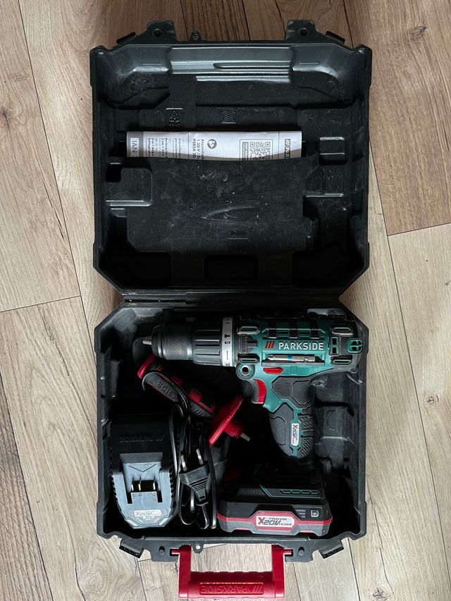 Taladro percutor inalámbrico Parkside. - Modelo PSBSA 20-Li B3. - Incluye batería de 20V y cargador. - Maletín de transporte.