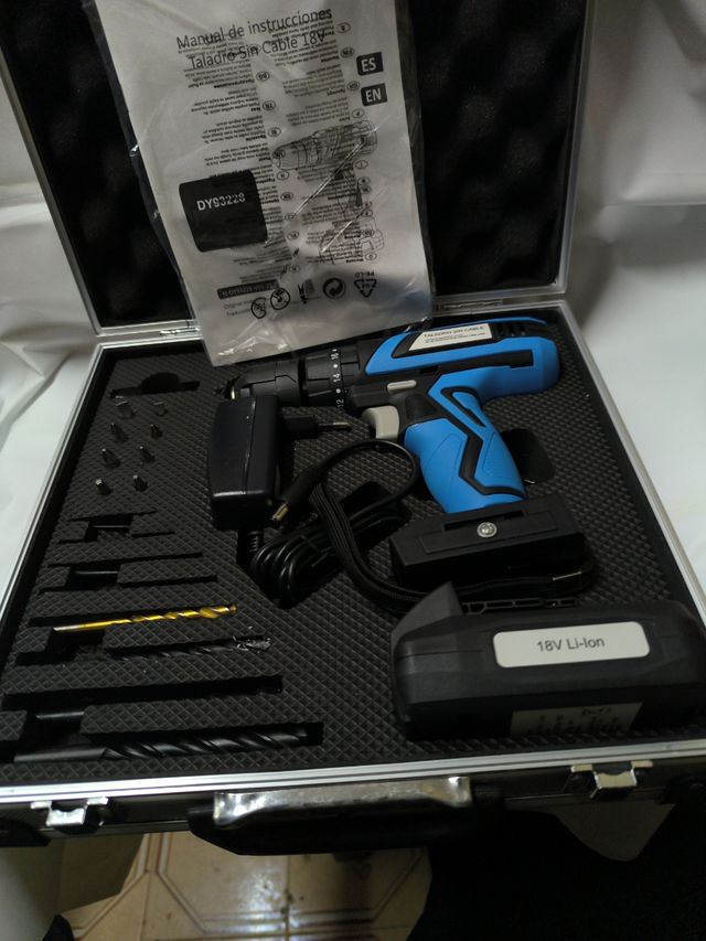 Taladro percutor con batería y cargador y accesorios, estado nuevo. Maletín no incluido No se admiten devoluciones ni cambios.