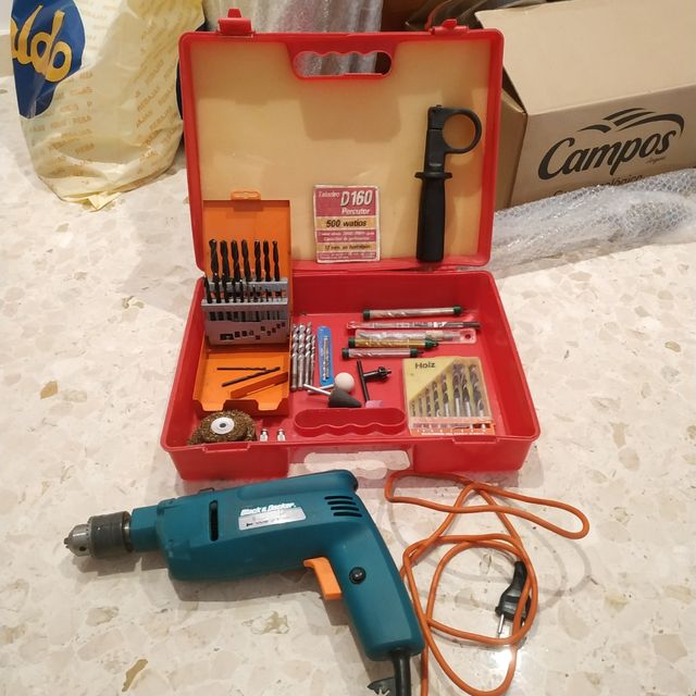 Detalles del productoTaladro D160 Percutor Black&Decker Portabrocas 10mm. Incluye brocas y accesorios. Medidas del producto