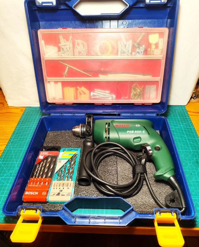 Detalles del productoTaladro con percusión BOSCH PSB 600-2 muy poco usado, mandril metálico, cordon en perfecto estado, mango, barilla de distancia y llave dentada para apriete. + Caja brocas Bosch para hormigón y brocas Wolfcraft para madera. + Maletín rigido en muy buen estado, que incluye caja con compartimentos. Todo como nuevo, es mi precio mínimo.